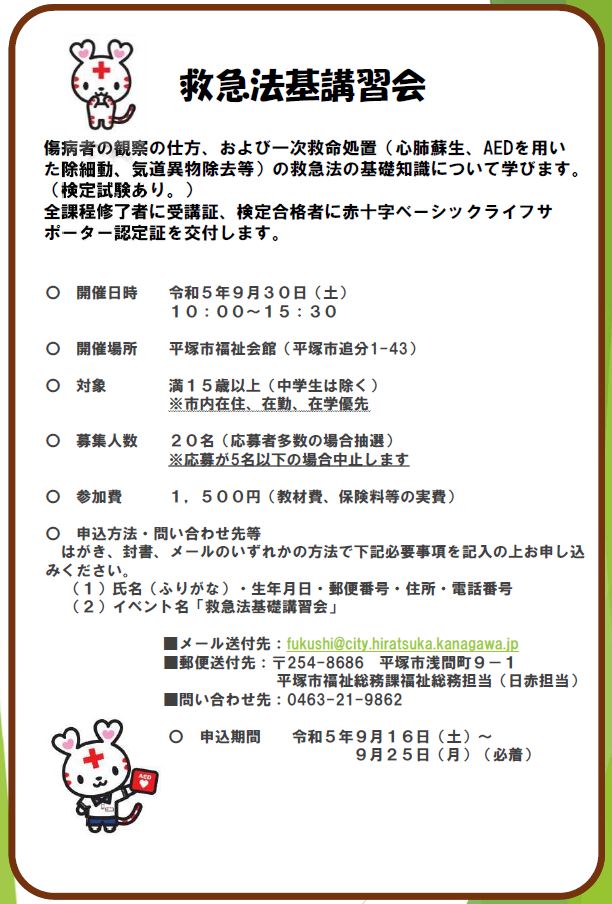 ※詳細は、今後の、9月15日発行の広報ひらつか、日赤平塚市地区ホームページでご確認ください。