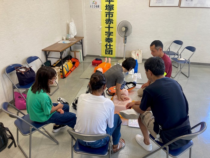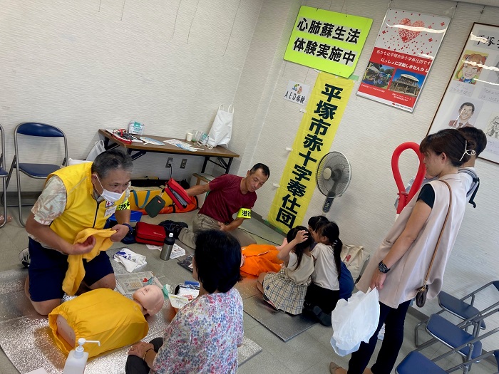 平塚市ボランティア協議会に加盟したことで港地区社会福祉協議会から声をかけていただき、9月16日(土)に港地区社会福祉協議会主催の「港福祉まつり」に「心肺蘇生法&AED体験コーナー」を出展しました。当日は親子など32名が立ち寄ってくださり、いざという時のための知識と技術をお伝えすることができました。9月10日の創立40周年記念式典でいただいた新しいAEDも初披露で大活躍しました♪ ブースにお立ち寄りいただいた皆さま、ありがとうございました。
