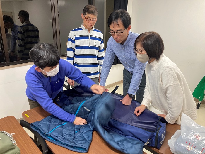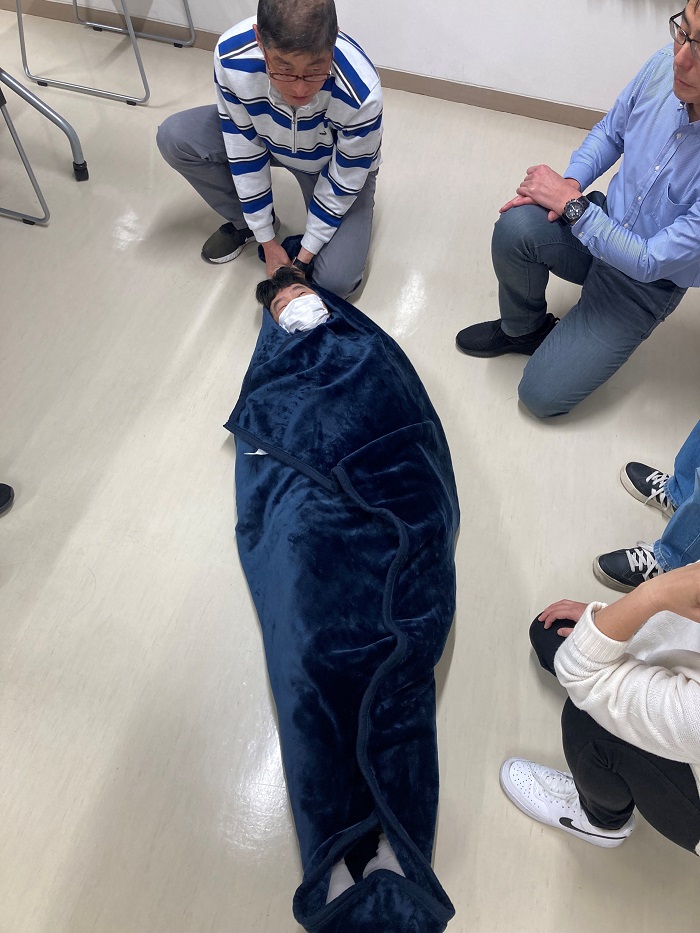 今回のテーマは、「10.18県西地区情報交換会で学んだ情報の共有」「40周年記念式典品としていただいたオートショック対応機能を備えた新しいAEDの使い方」「搬送法(毛布・担架)」を団員同士で教え合い学び合いました。防災食レシピは実際に皆で作って試食し、「おいしい!」「簡単!」と大好評でした。
