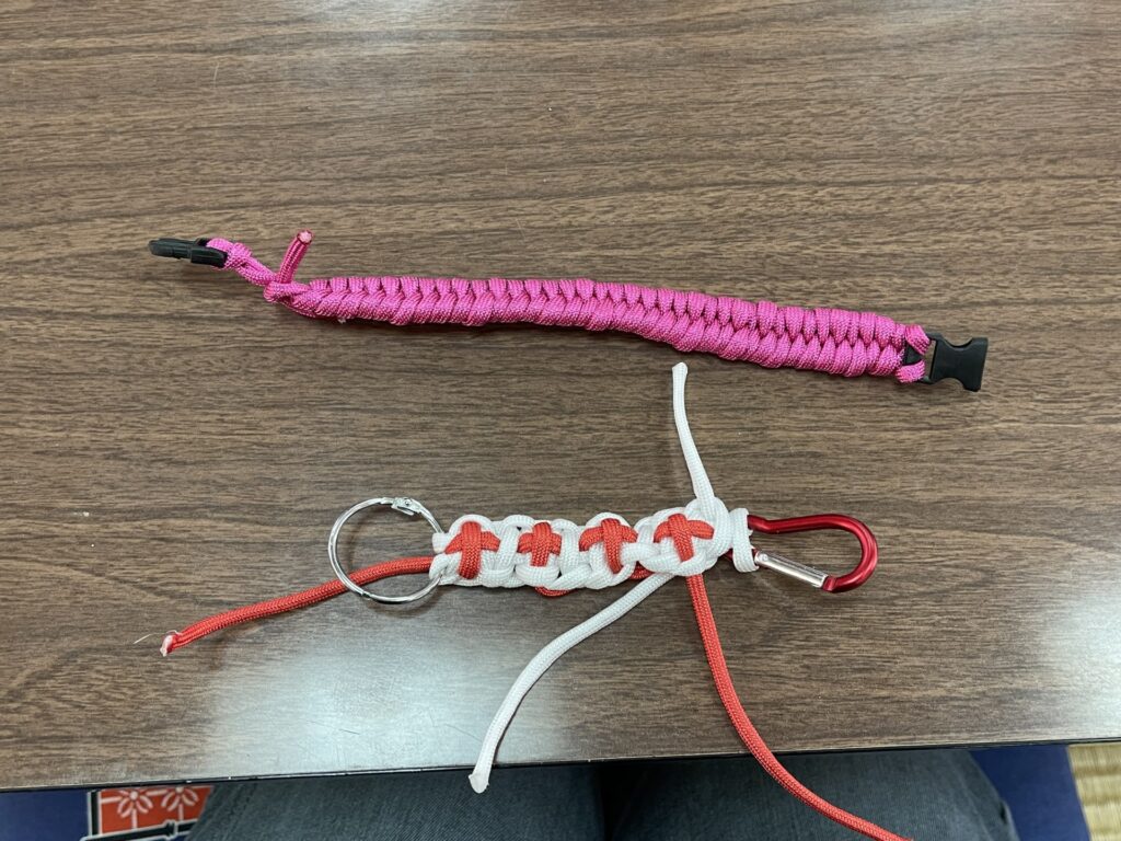 午後は、防災用品として注目されているパラコードを使って、ブレスレットと赤十字マークのキーホルダーを作成しました。